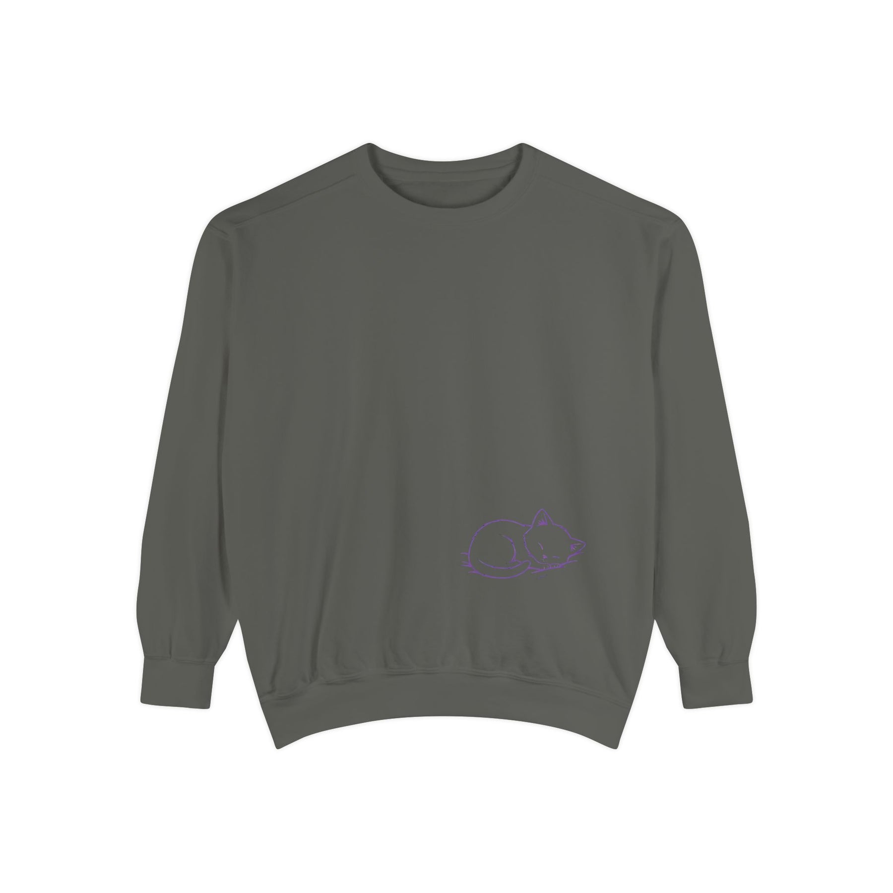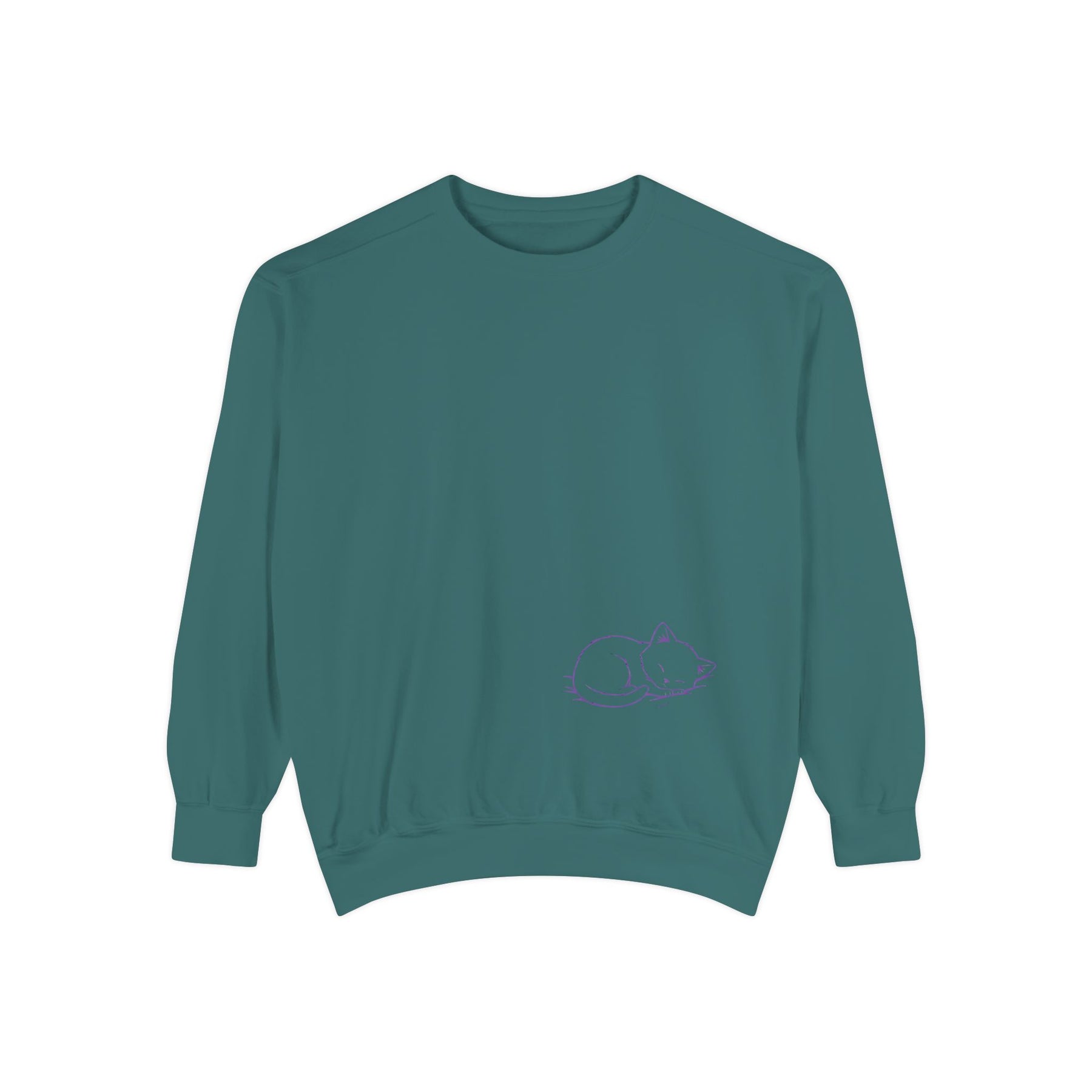 A relaxed, garment-dyed sweatshirt that feels like a warm, quiet afternoon with feline friends piled across your lap. The soft, medium-heavy cotton-blend drapes easily while the ribbed collar, cuffs, and hem keep the shape grounded. A sweet illustration of snoozing cats on the chest brings a gentle, cozy charm — the kind of piece you reach for when you want comfort without fuss. Subtle details like the half-moon neck patch, twill neck tape, and sewn-in label give it a thoughtful, lived-in quality. OEKO-TEX low-impact dyes and sturdy ring-spun fabric mean it wears well and keeps its color through many lazy days.