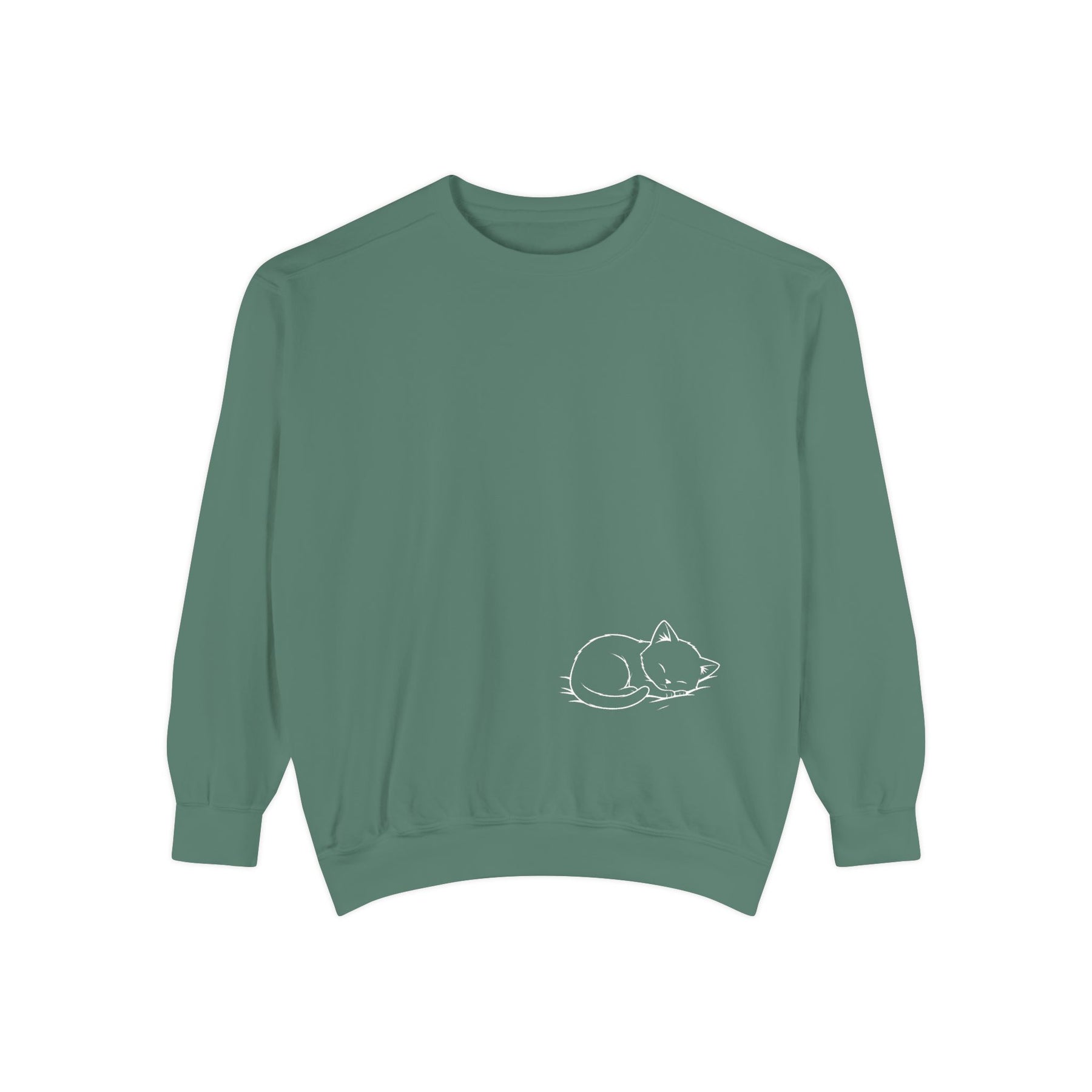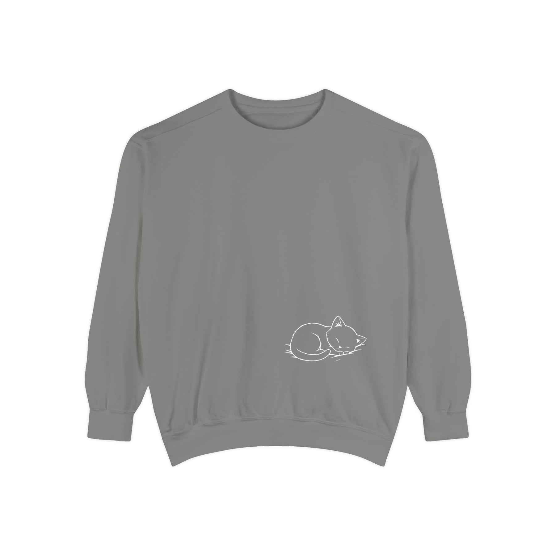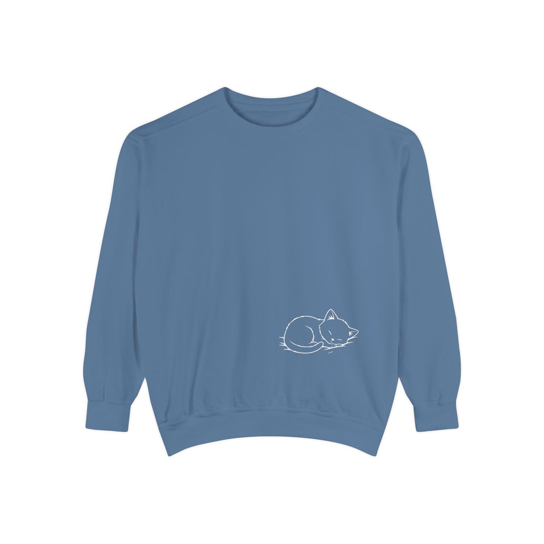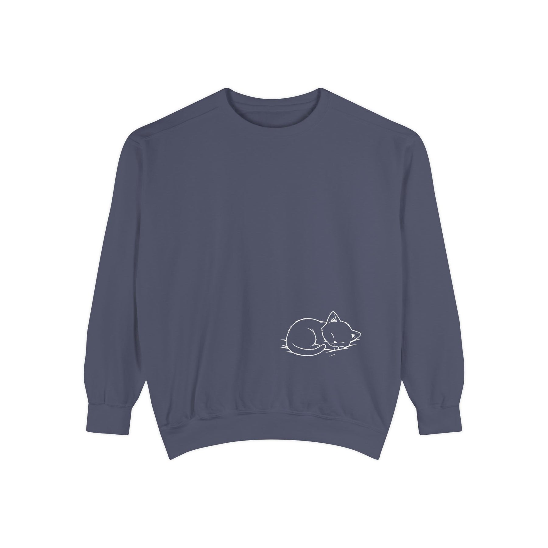 A relaxed, garment-dyed sweatshirt that feels like a warm, quiet afternoon with feline friends piled across your lap. The soft, medium-heavy cotton-blend drapes easily while the ribbed collar, cuffs, and hem keep the shape grounded. A sweet illustration of snoozing cats on the chest brings a gentle, cozy charm — the kind of piece you reach for when you want comfort without fuss. Subtle details like the half-moon neck patch, twill neck tape, and sewn-in label give it a thoughtful, lived-in quality. OEKO-TEX low-impact dyes and sturdy ring-spun fabric mean it wears well and keeps its color through many lazy days.