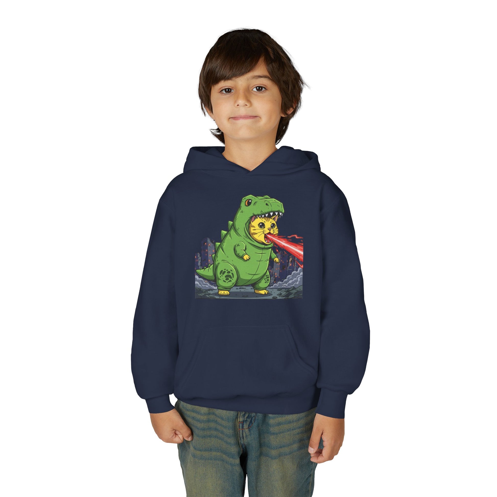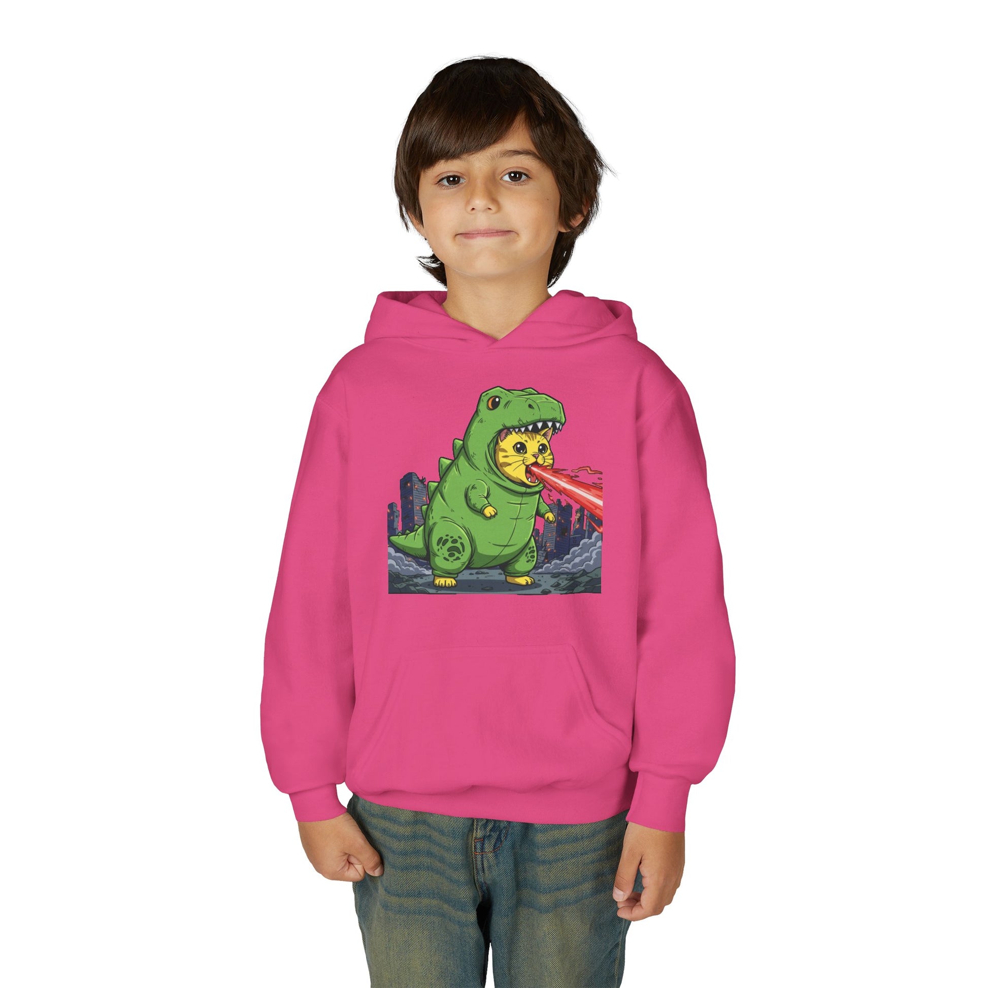 Introducing our Cat cosplay Godzilla Unisex Kids Hoodie style 4 - Fun & Cozy Heavy Blend Sweatshirt with Cute Design, the perfect blend of comfort and fun! This cozy hoodie wraps your child in warmth, making it ideal for cool days at school, family outings, or cozy nights in. Featuring a playful dinosaur design, it adds a whimsical touch to any kid's wardrobe. The kangaroo pocket is perfect for keeping little hands warm or storing treasures during adventures. Made from a super soft cotton-polyester blend, it offers durability and a soft feel, perfect for everyday wear. Great for birthdays, holidays, or just because, this sweatshirt is sure to be a hit with young dino lovers!