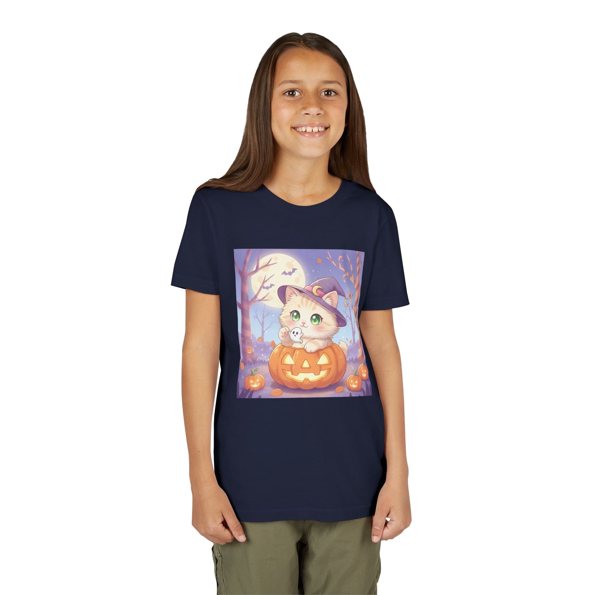 Halloween cute kitten anime style 1 Unisex Youth Tee | T-Shirt, Cute Pumpkin Shirt, Kids Halloween Outfit, Cat Lover Gift, Fun Fall Apparel