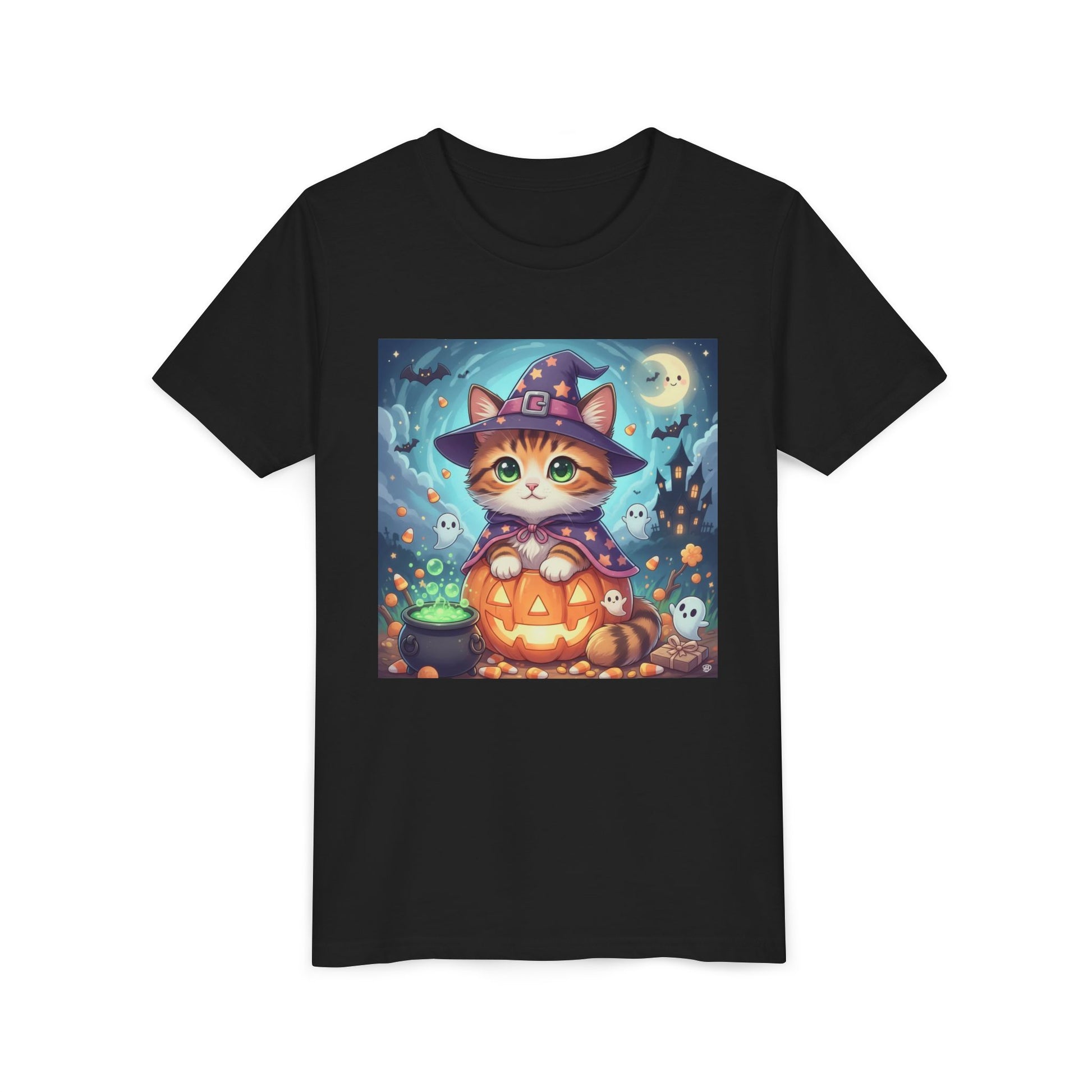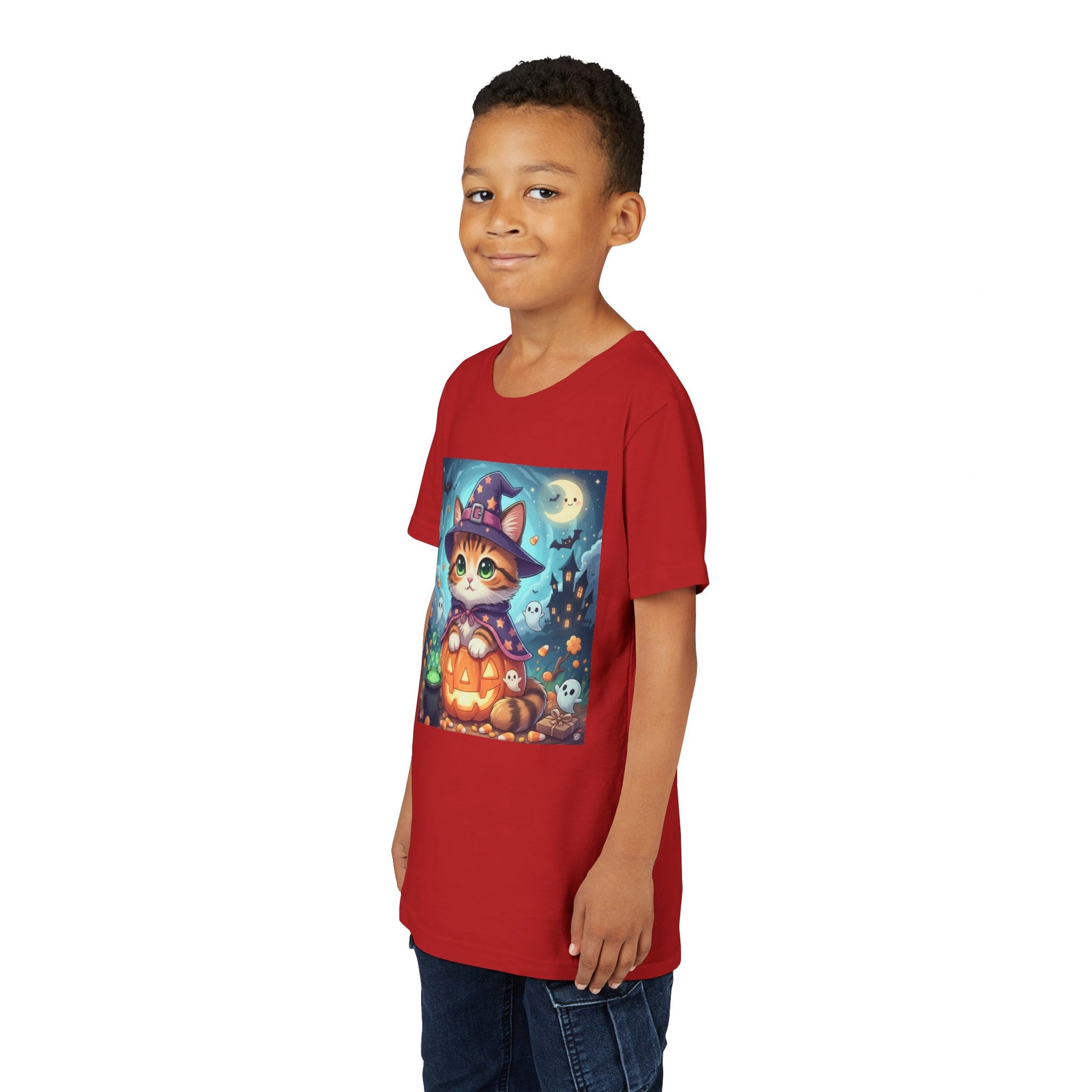 Halloween cute kitten anime style 2 Unisex Youth Tee | T-Shirt, Cute Pumpkin Shirt, Kids Halloween Outfit, Cat Lover Gift, Fun Fall Apparel