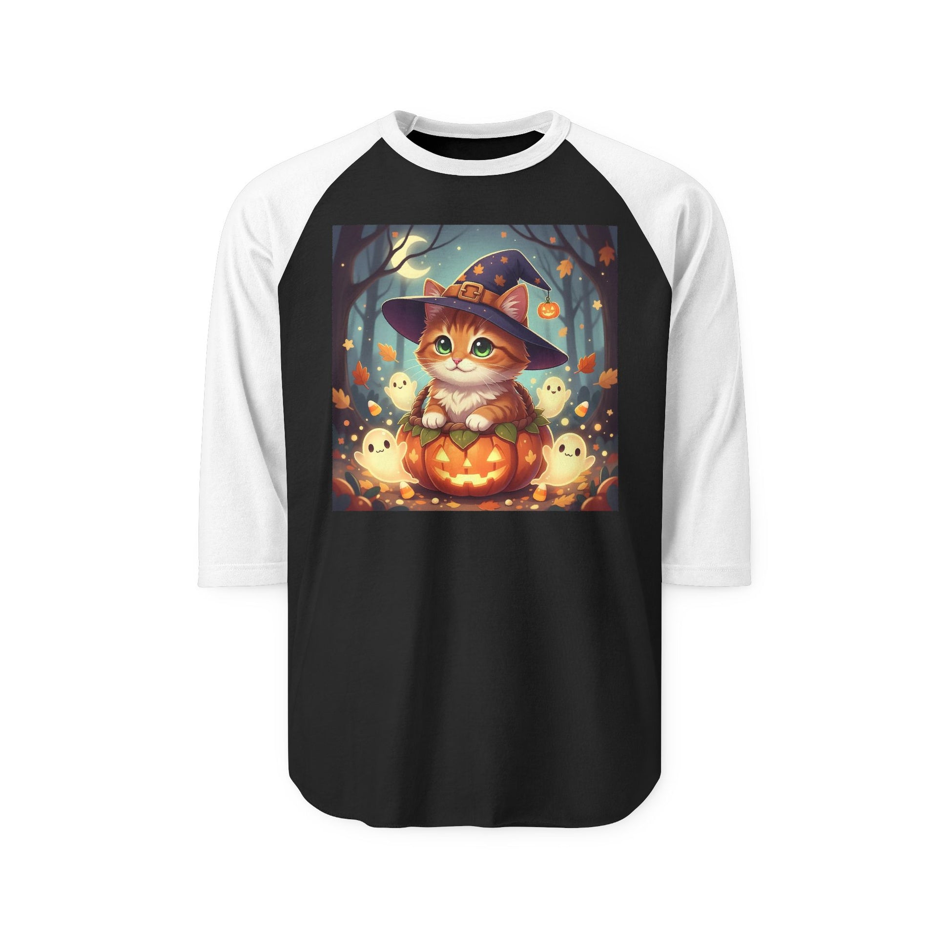 Halloween cute kitten anime style 3 Raglan Shirt, Unisex Halloween Top, Pumpkin Cat Shirt, Cute Cat Tee, Spooky Casual Wear